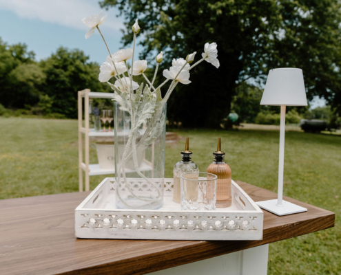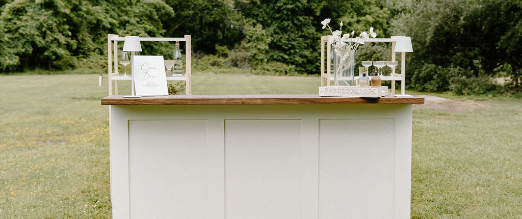 A sophisticated wedding-ready bar experience featuring our signature board-and-batten Chessie Bar, ivory-draped back bar table, elegant white bar lamps, and all essential service equipment. Includes delivery and full setup by our team. Optional décor upgrades available for a fully styled look.